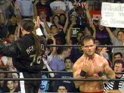 Flair, meanwhile, came to the ring one Thursday night with a surprise for Mean Gene; a returning Barry Windham. The old school Horseman wasn't a new member, but Flair was simply glad to see him back. It wasn't long before Bischoff made his way to ringside, telling Barry there's no room for him in WCW. Later in the program, Bret Hart took on Chris Benoit in a fabulous little match that Chris took via DQ. When Hart didn't like the decision and clobbered Benoit with a chair, Malenko tried to make the save. When Hart flattened Dean with the chair as well, DDP finally ran him off for good.