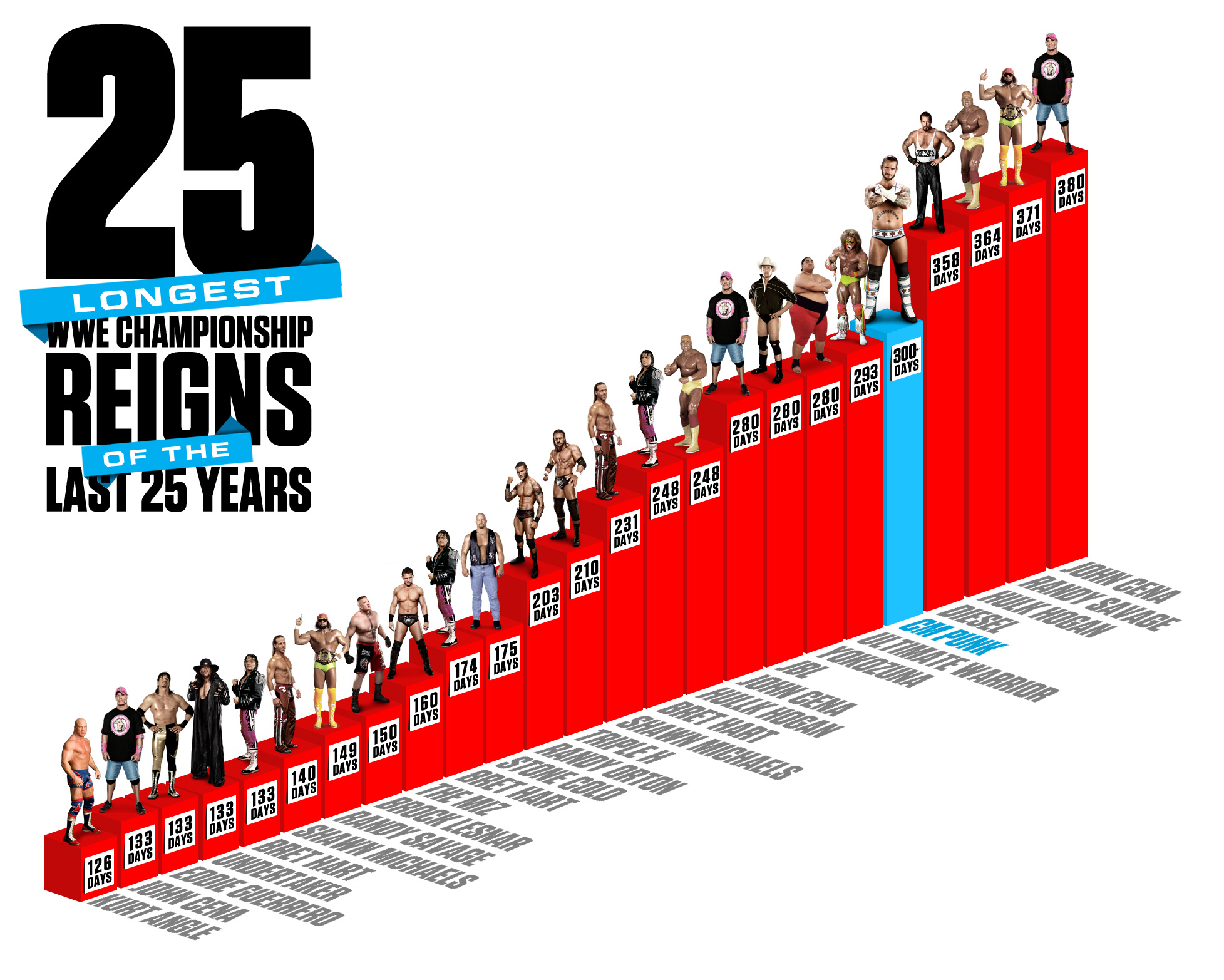 WWE.com published an article today discussing the 25 longest WWE title reigns of the past 25 years.  The graphic shown above is pretty cool, and it’s interesting to see where CM Punk stacks up historically.