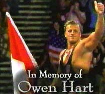 Monday Night RAW had numerous segments, with wrestlers and office personnel expressing their feelings about Owen….many of which were humorous, telling of Hart’s legendary “ribs” in the locker room and on the road. Other reminiscences were deeply felt, by friends like Paul Levesque, Jeff Jarrett, Debra McMichael, and Brian James, repeatedly breaking down while sharing their feelings with the TV and live audiences. Inbetween these segments were matches dedicated to Owen Hart, devoid of existing storylines, so that as many wrestlers as possible could work matches to pay tribute to their friend. Special mentions of Hart were done all night by the boys, using special forms of all the traditional tag lines of most of the wrestlers.