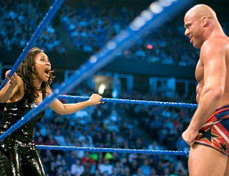 Hunting for Guttersluts: There are often controversial storylines in the WWE that can be considered borderline shameful. Personally, as long as a storyline has to do with WRESTLING, or the WRESTLERS, then I’m okay with it. This storyline pushed the envelope, but at least led to some intense matches in the ring. For whatever reason, Kurt Angle began portraying himself as a ‘dirty pervert’ who enjoyed the company of “Guttersluts”. The Gutterslut that happened to catch his eye was the wife of Booker T, the beautiful Sharmell, who had a stint in WCW as a Nitro Girl before moving on as a RAW interviewer. Sharmell played the part, and screamed in terror while standing behind her man, who gallantly defended her honor. Way to go Book. You da man! |