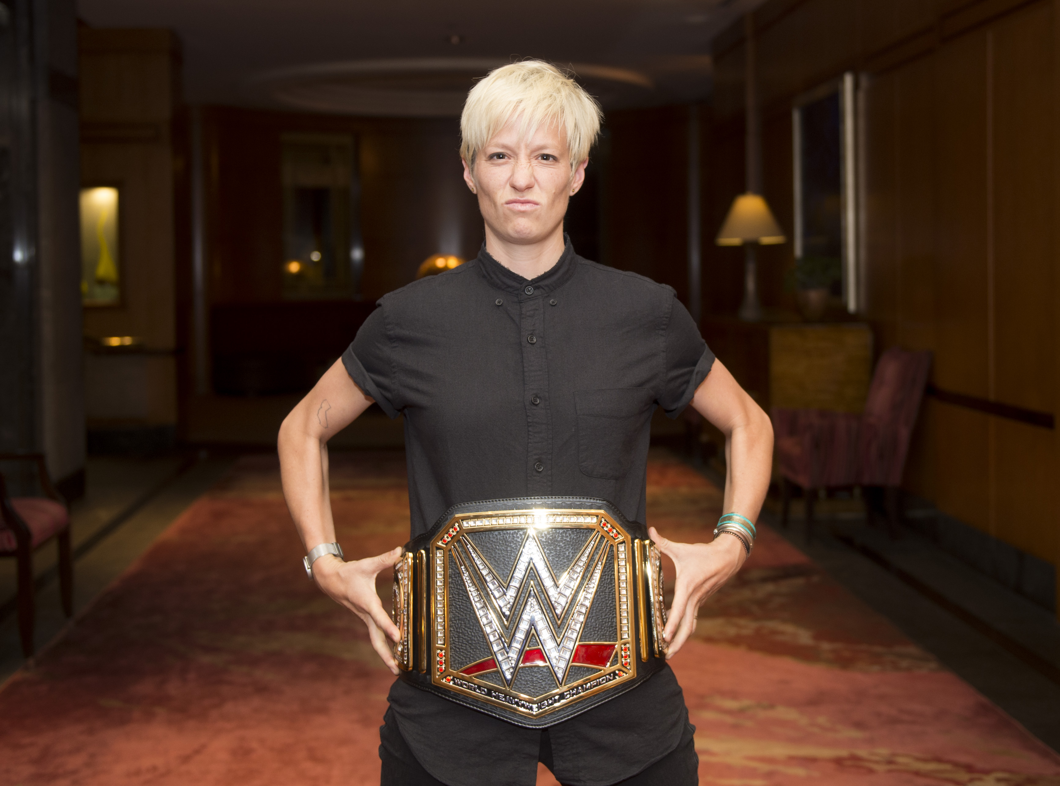 Megan Rapinoe celebrates like a champion July 10, 2015 by OWW Contributor New York, New York – July 9, 2015: Ali Krieger and Megan Rapine of the USWNT appeared on The Rachel Maddow Show on MSNBC. US Women’s Soccer midfielder Megan Rapinoe celebrated her team’s championship with the WWE world heavyweight championship belt.