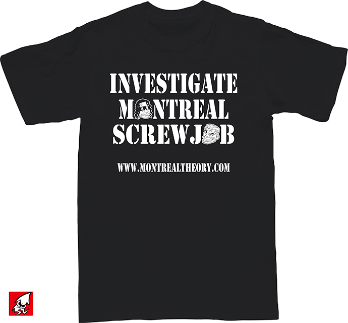 Now, you can own the very first in a line of Montreal Theory T-Shirts. This black 100% pre-shrunk cotton shirt has “Investigate Montreal Screwjob” on the front, in the popular bold and impactful font used by other similar conspiracy-style shirts. Logo is complete with illustrations of Bret & Vince themselves, plus the MontrealTheory.com website.