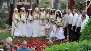 Brie stole the show in a Katie May wedding gown at the “country rustic”-themed, casual wedding. The bridesmaids wore boho-chic white dresses, while the groomsmen donned dark jeans, white button-down shirts, suspenders and bow ties. The wedding party wore TOMS shoes, except for Brie, who was given a pair of Yves Saint Laurent heels from her twin. (Brie admitted she’d rather go barefooted!) Also, Josie, the happy couple’s French Bulldog, joined four flower girls and one ring bearer at the ceremony.