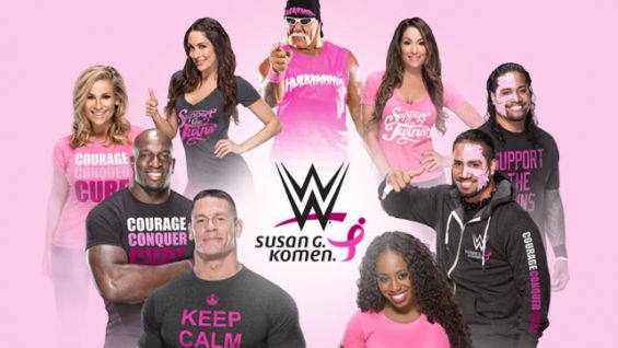 STAMFORD, Conn., September 29, 2014 – WWE (NYSE: WWE) and Susan G. Komen® will expand their partnership for their third annual breast cancer awareness campaign beginning tonight on Monday Night Raw® with WWE Superstars and Divas wearing co-branded Susan G. Komen and WWE apparel and WWE platforms “going pink.” The “Courage Conquer Cure” campaign will continue throughout National Breast Cancer Awareness month, and WWE will donate to Komen 20 percent of the retail sales price of all co-branded merchandise sold on WWEShop.com and at WWE live events, as well as